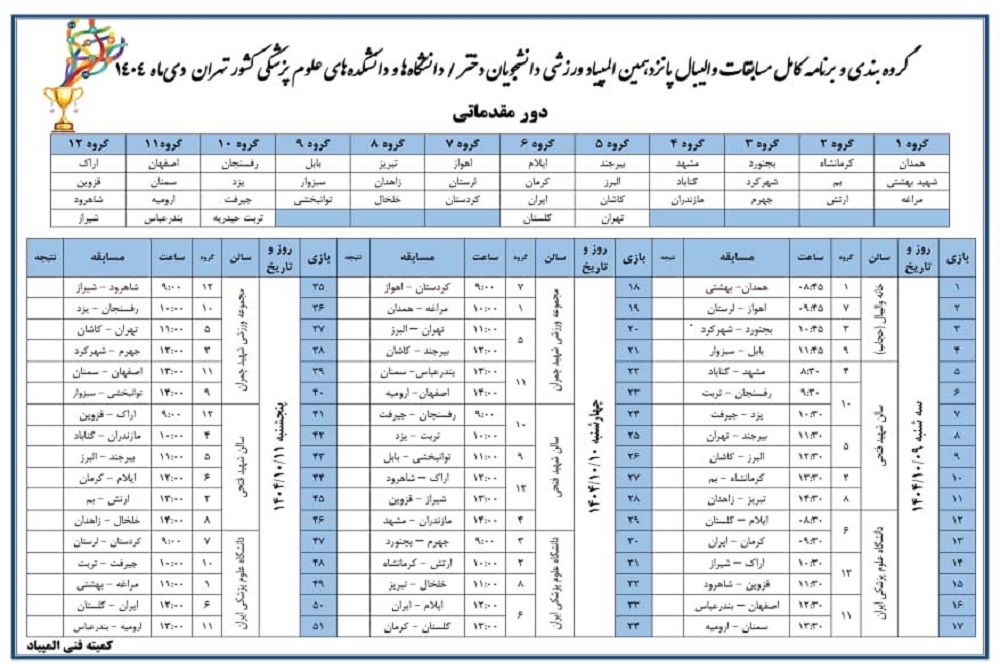 بر اساس نتایج قرعه کشی، تیم دانشگاه ایران در گروه ششم این مسابقات قرار گرفت و با تیمن های دانشگاه علوم پزشکی ایلام،کرمان و گلستان همگروه شد.