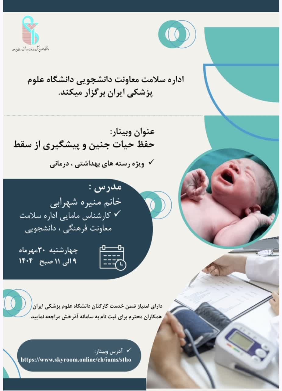 اداره سلامت معاونت دانشجویی دانشگاه، وبیناری با عنوان حفظ حیات جنین و پیشگیری از سقط، ویژه رسته های بهداشتی، درمانی توسط استاد منیژه شهرابی(کارشناس مامایی اداره سلامت معاونت فرهنگی دانشجویی)روز چهارشنبه ۳۰ مهرماه ۱۴۰۴ برگزار میکند.
