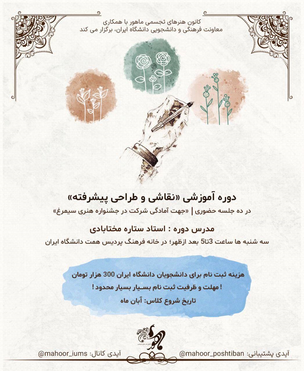 کانون هنرهای تجسمی ماهور با همکاری معاونت فرهنگی و دانشجویی دانشگاه ایران دوره آموزشی «نقاشی و طراحی پیشرفته» را برگزار میکند.