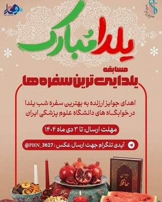 علاقهمندان میتوانند جهت شرکت در این مسابقه، عکسهایی از سفره زیبای شب یلدای خود را با ذکر نام خوابگاه و مشخصات خود به آیدی تلگرامی @PHN_۳۶۲۷ ارسال کنند.